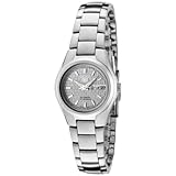 Combining the convenience of battery-free operation with a sleek silver design, the Seiko Women's Stainless Steel Watch is a modern classic. This streamlined timepiece boasts 21-jewel Japanese automatic movement, which means it's powered via movement of your arm. It also features a polished stainless steel case and a textured silver dial with luminous silver hands, silver hour markers, and English/Spanish day and date box at three o'clock. Water-resistance to 99 feet (30 meters) and a mineral Hardlex crystal provide optimum durability, while a fold-over push-button clasp with safety makes for easy on/off and a secure fit. Read more